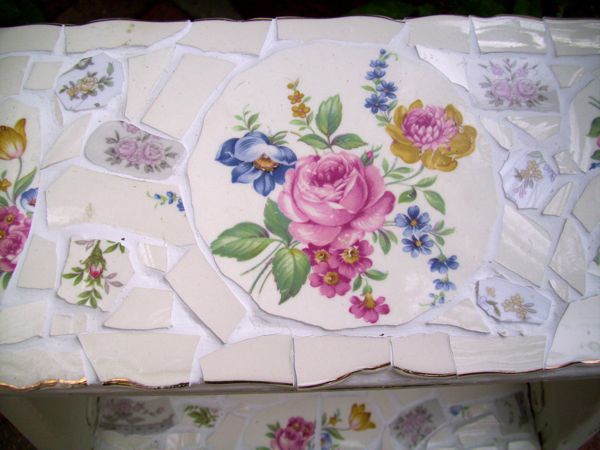 I think your mosaic work from the broken china is outstanding. I have made window boxes using broken china and know how much time and work you put into your projects...Nice job. If you would like to see my boxes, you can view my blog and look under my March/April (I believe) to see some on my cottage and also my cottage store.